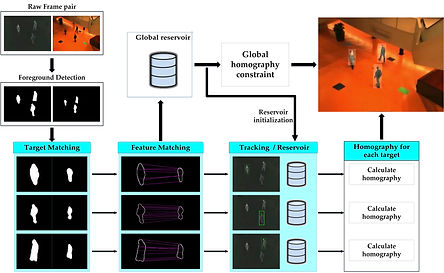 target independently. We present a fast and robust feature matching strategy, where only the features on the corresponding foreground pairs are matched. Besides, new reservoirs based on the Gaussian criterion are created for all targets, and a multi-target tracking method is adopted to determine the relationships between the reservoirs and foreground blobs. With the matches in the corresponding reservoir, the homography of each target is computed according to its moving state. We tested our framework on both public near-planar and non-planar datasets. The results demonstrate that the proposed framework outperforms the state-of-the-art global registration method and the manual global registration matrix in all tested datasets.